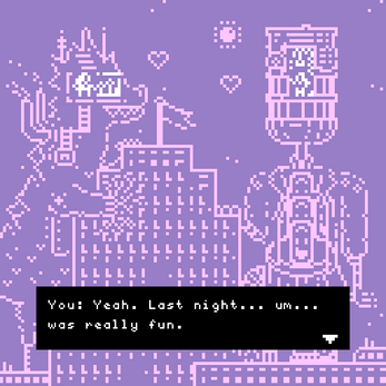 This is adorable! I love the cozy atmosphere and your pixel art totally sells it. This kinda makes me want to make all the dialogue in my game read like this - love the emoticons, the blushing was perfect.
